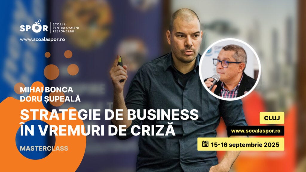 Participă la Masterclass despre strategie de business în vremuri de criză. Două zile în care înveți să transformi crizele în oportunități și să-ți regândești direcția de business. Dacă ai senzația că ce mergea anul trecut acum nu mai funcționează, dacă ai resurse limitate și vrei să le investești cu grijă, dacă piața se schimbă mai repede decât reușești să te adaptezi sau dacă vrei o echipă care să nu se blocheze în fața incertitudinii, acest masterclass e pentru tine.
